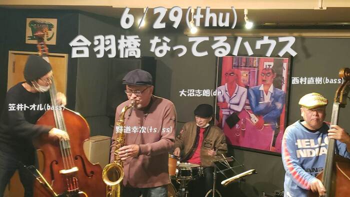 Thursday, Jun 29, 2023 open 19:00 start 19:30 ¥2,300 野道幸次(sax) 西村直樹(b) 笠井トオル(b)大沼志朗(ds) 野道さん、笠井さんの名古屋コンビと大沼さんのトリオに、西村さんが入っての2ベースカルテット!ど迫力なジャズサウンド。(ヨ)