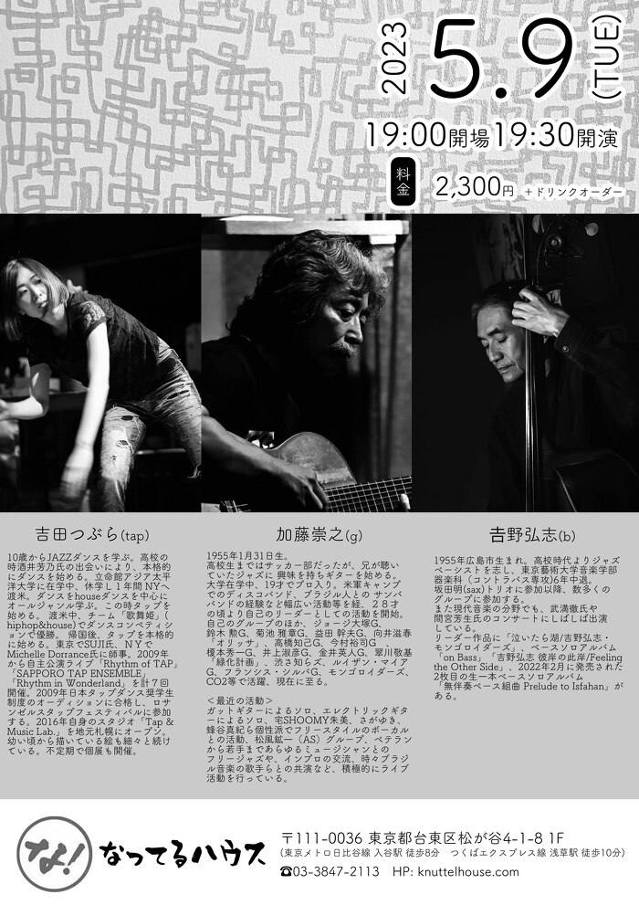 Tuesday, May 09, 2023 open 19:00 start 19:30 ¥2,300 加藤崇之(g) 吉野弘志(b) 吉田つぶら(tap) TRIO 札幌と東京で活動するタップのつぶらさんと名人で盟友の加藤さん&吉野さんの特別トリオ。曲と即興をお届けしてもらいます。(ヨ)