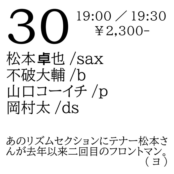 Tuesday, May 30, 2023 open 19:00 start 19:30 ¥2,300 松本卓也(sax) 不破大輔(b) 山口コーイチ(p) 岡村太(ds) あのリズムセクションにテナー松本さんが去年以来二回目のフロントマン。(ヨ)