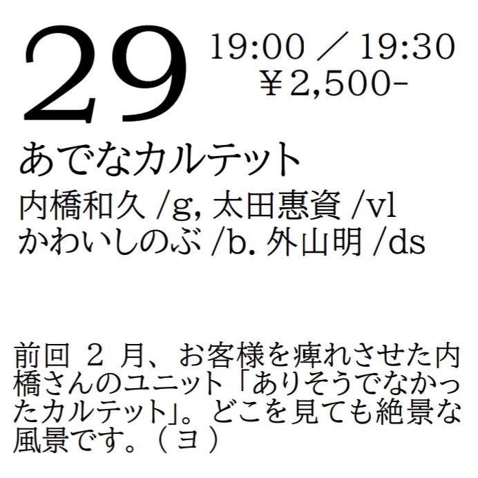 Monday, May 29, 2023 open 19:00 start 19:30 ¥2,500 あでなカルテット/ 内橋和久(g) 太田惠資(vl) かわいしのぶ(b) 外山明(ds) 前回2月、お客様を痺れさせた内橋さんのユニット「ありそうでなかったカルテット」。どこを見ても絶景な風景です。(ヨ)