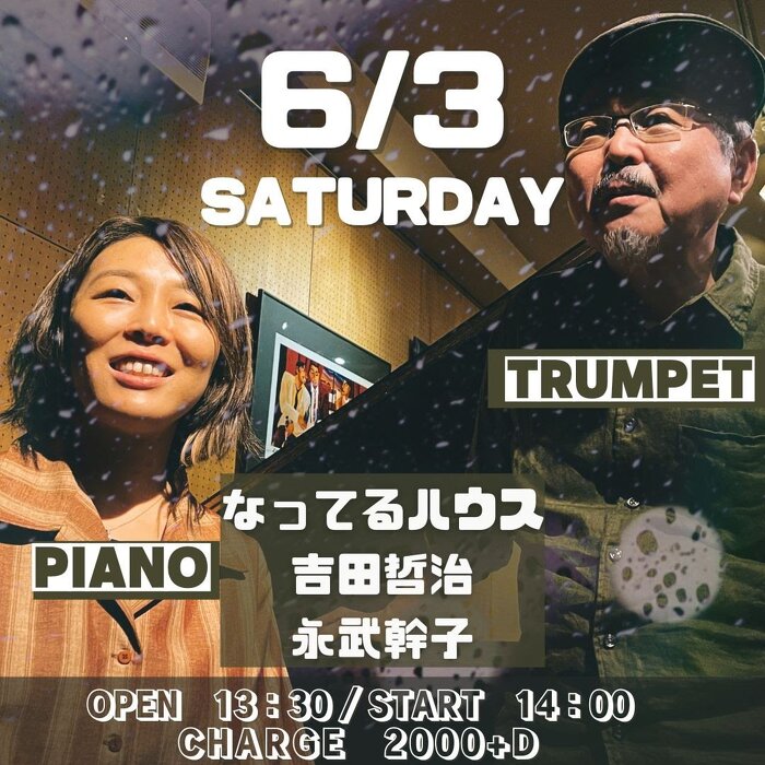 Saturday, Jun 03, 2023 open 13:30 start 14:00 ¥2,000 吉田哲治(tp) 永武幹子(p) 休日のお昼で定着した吉田さんの個性豊かな曲を永武さんのピアノと共に奏でるDUO。シンプルながらエモーショナルなサウンドです。(ヨ)
