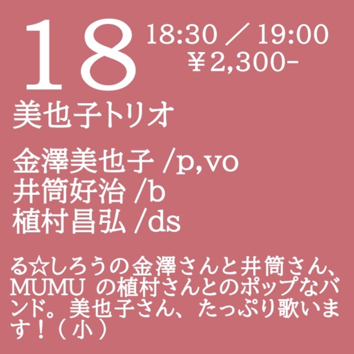 る☆しろうの金澤さんと井筒さん、MUMUの植村さんとのポップなバンド。美也子さん、たっぷり歌います!(小)