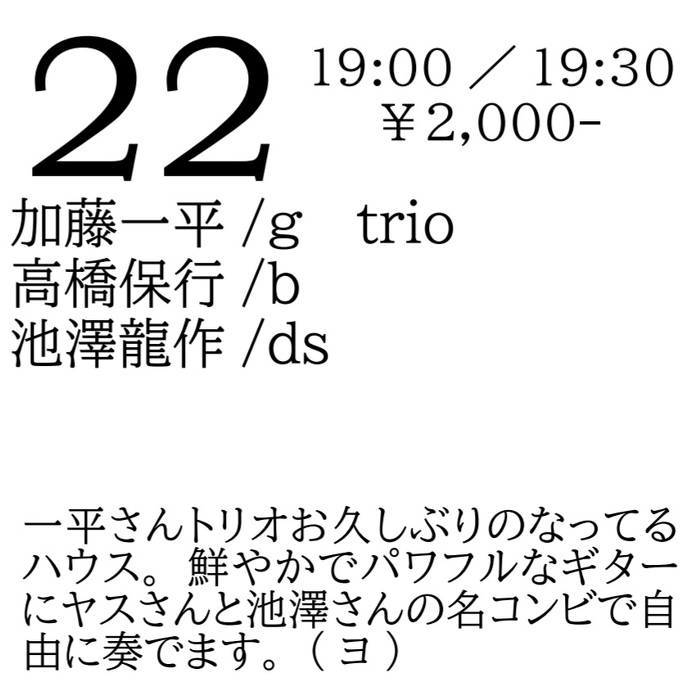 Thursday, Jun 22, 2023 open 19:00 start 19:30 ¥2,000 加藤一平(g) trio/ 高橋保行(b) 池澤龍作(ds) 一平さんトリオお久しぶりのなってるハウス。鮮やかでパワフルなギターにヤスさんと池澤さんの名コンビで自由に奏でます。(ヨ)