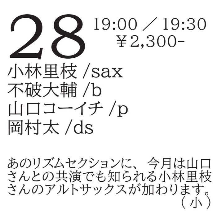 Wednesday, Jun 28, 2023 open 19:00 start 19:30 ¥2,300 小林里枝(sax) 不破大輔(b) 山口コーイチ(p) 岡村太(ds) あのリズムセクションに、今月は山口さんとの共演でも知られる小林里枝さんのアルトサックスが加わります。(小)