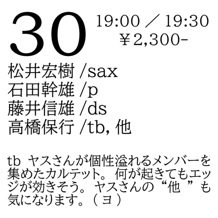 Friday, Jun 30, 2023 open 19:00 start 19:30 ¥2,300 松井宏樹(sax) 石田幹雄(p) 藤井信雄(ds) 高橋保行(tb,他) tbヤスさんが個性溢れるメンバーを集めたカルテット。何が起きてもエッジが効きそう。ヤスさんの"他"も気になります。(ヨ)
