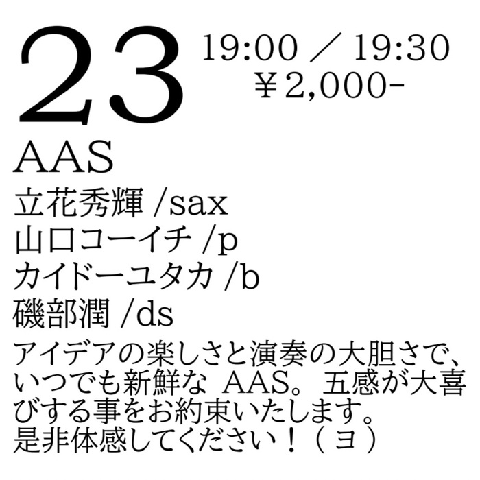 Friday, Jun 23, 2023 open 19:00 start 19:30 ¥2,000 AAS/立花秀輝(sax) 山口コーイチ(p) カイドーユタカ(b) 磯部潤(ds) アイデアの楽しさと演奏の大胆さで、いつでも新鮮なAAS。五感が大喜びする事をお約束いたします。是非体感してください!(ヨ)