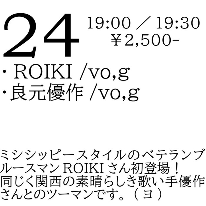 Monday, Jul 24, 2023 open 19:00 start 19:30 ¥2,500 ・ROIKI(vo,g) ・良元優作(vo,g) ミシシッピースタイルのベテランブルースマンROIKIさん初登場!同じく関西の素晴らしき歌い手優作さんとのツーマンです。(ヨ)