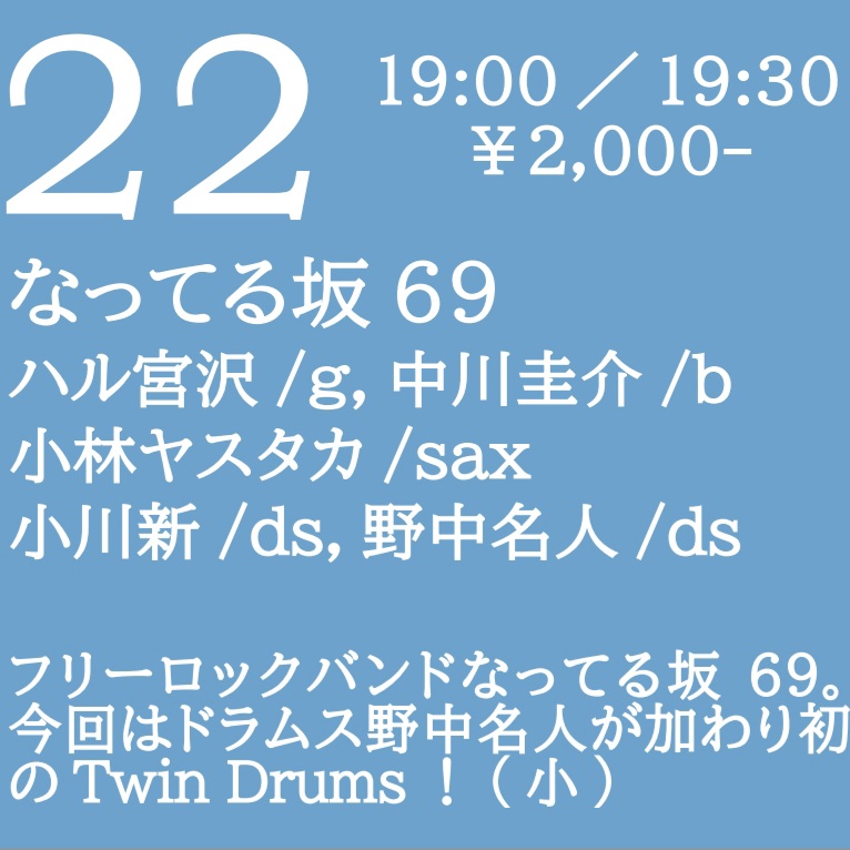 Saturday, Jul 22, 2023 open 19:00 start 19:30 ¥2,000 なってる坂69(ロックあるいはシックスティナイン)/ ハル宮沢(g) 中川圭介(b) 小林ヤスタカ(sax) 小川新(ds)+野中名人(ds) フリーロックバンドなってる坂69、今回はドラムス野中名人が加わり、初のTwin Drums!。(小)
