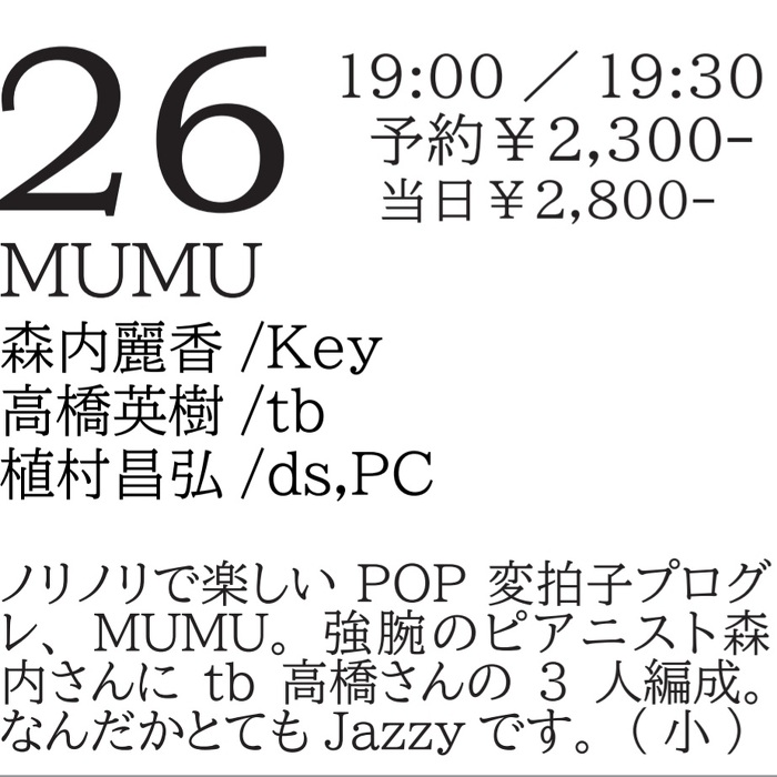 Wednesday, Jul 26, 2023 open 19:00 start 19:30 予約¥2300 当日¥2800 MUMU/森内麗香(Key) 高橋英樹(tb) 植村昌弘(ds,PC) ノリノリで楽しいPOP変拍子プログレ、MUMU。強腕のピアニスト森内さんにtb高橋さんの3人編成。なんだかとてもJazzyです。(小)
