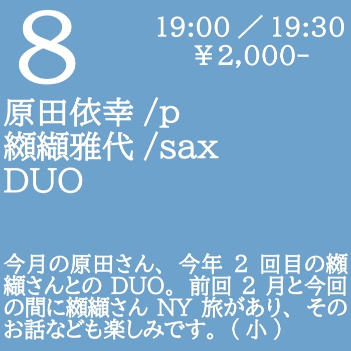 今月の原田さん、今年2回目の纐纈さんとのDUO。前回2月と今回の間に纐纈さんNY旅があり、そのお話なども楽しみです。(小)