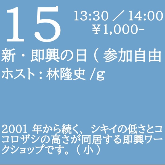 Saturday, Jul 15, 2023 open 13:30 start 14:00 ¥1,000 新・即興の日(参加自由) ホスト:林隆史(g) 2001年から続く、シキイの低さとココロザシの高さが同居する即興ワークショップです。(小)