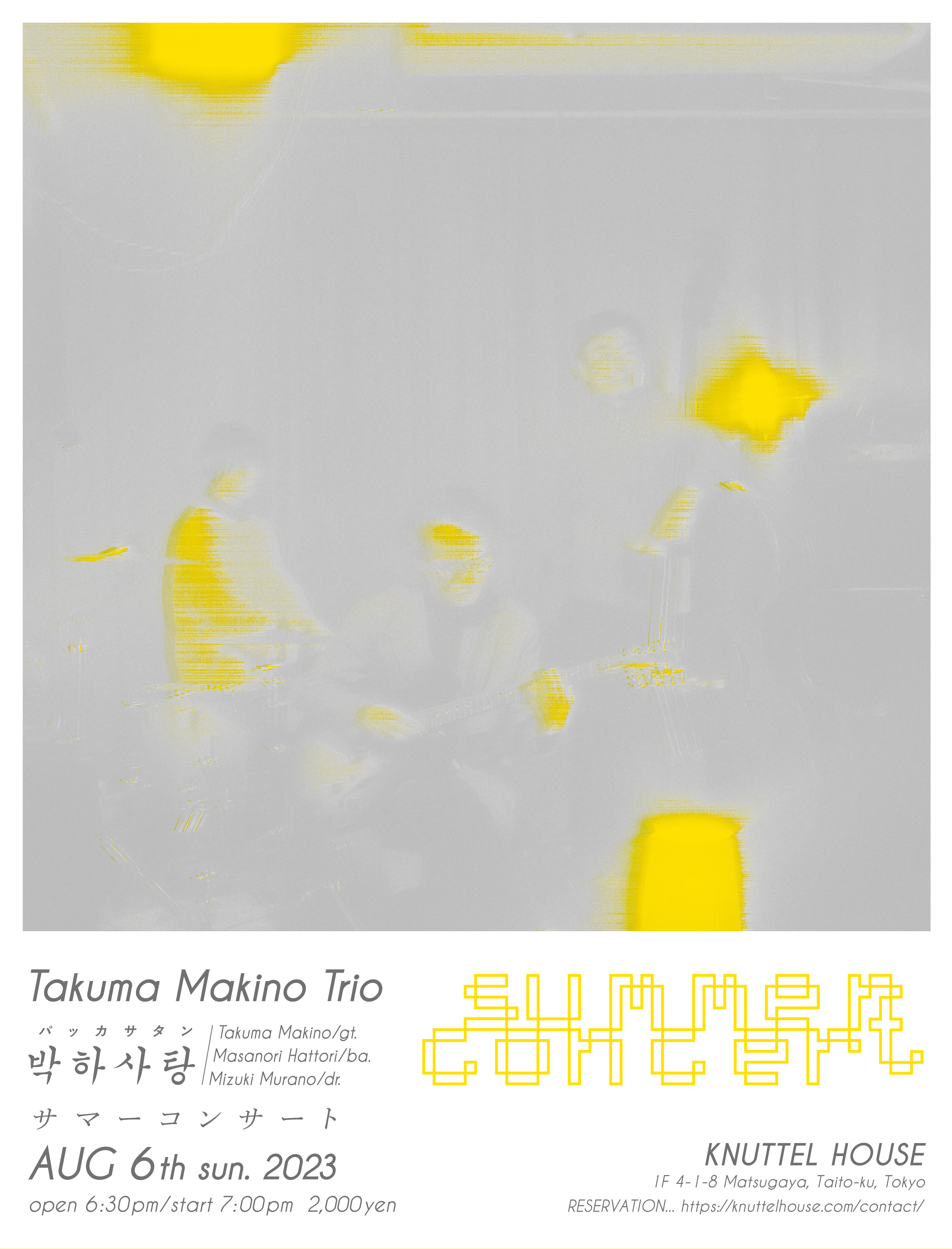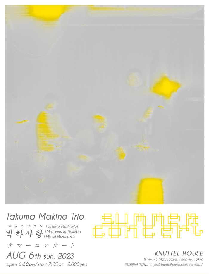 Sunday, Aug 06, 2023 満席となりました open 18:30 start 19:00 ¥2,000 牧野琢磨(g)・トリオ・パッカサタン/ 服部将典(b) 村野瑞希(ds) サマー・コンサート インストバンドNRQ牧野さんの今年始動したジャズギタートリオが初登場。牧野さんのセンスが光る独自のジャズ。楽しみであります。(ヨ)