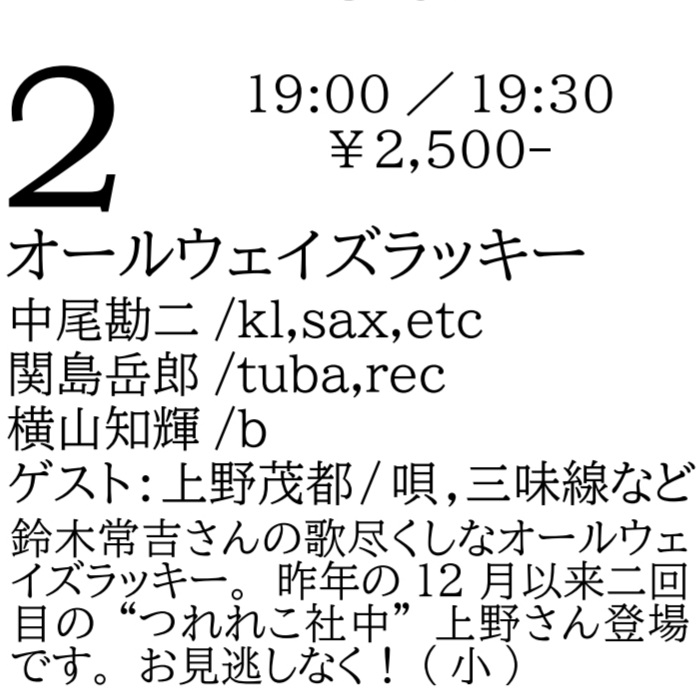 オールウェイズラッキー/ 中尾勘二(kl,sax,etc) 関島岳郎(tuba,rec) 横山知輝(b) ゲスト:上野茂都(唄、三味線など)