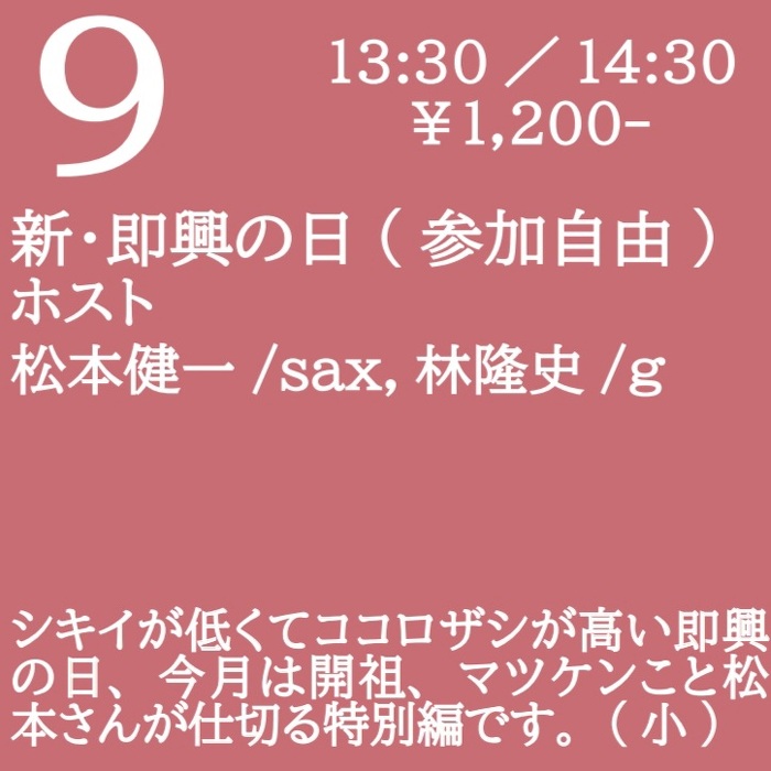Sunday, Jun 09, 2024 open 13:30 start 14:00 ¥1,200 新・即興の日(参加自由) ホスト:松本健一(sax) 林隆史(g) シキイが低くてココロザシが高い即興の日、今月は開祖、マツケンこと松本さんが仕切る特別編です。(小)
