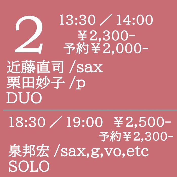 2025年3月2日(日) open 13:30 start 14:00 ¥2,300(予約¥2,000) 近藤直司(sax) 栗田妙子(p) DUO 当店で録音したアルバム「知らない人」も好評であるデュオ。どこか悲しげであり胸が震える音楽です。(ヨ)