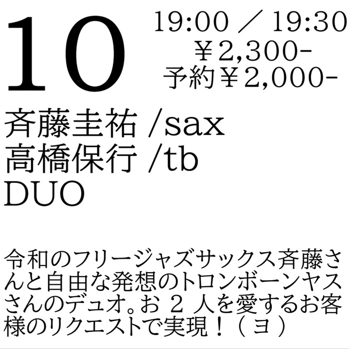 2025年3月10日(月) open 19:00 start 19:30 ¥2,300(予約¥2,000) 斉藤圭祐(sax) 高橋保行(tb) DUO 令和のフリージャズサックス斉藤さんと自由な発想のトロンボーンヤスさんのデュオ。お2人を愛するお客様のリクエストで実現!(ヨ)