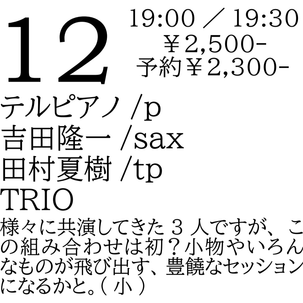 2025年3月12日(水) open 19:00 start 19:30 ¥2,500(予約¥2,300) テルピアノ(p) 吉田隆一(sax) 田村夏樹(tp) TRIO 様々に共演してきた3人ですが、この組み合わせは初?小物やいろんなものが飛び出す、豊饒なセッションになるかと。(小)