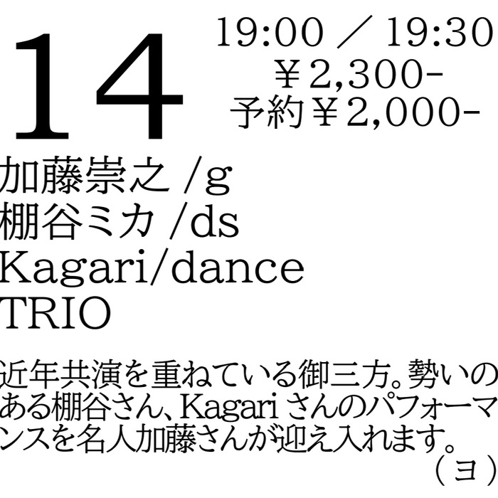2025年3月14日(金) open 19:00 start 19:30 ¥2,300(予約¥2,000) 加藤崇之(g) 棚谷ミカ(ds) Kagari(dance) TRIO 近年共演を重ねている御三方。勢いのある棚谷さん、Kagariさんのパフォーマンスを名人加藤さんが迎え入れます。(ヨ)
