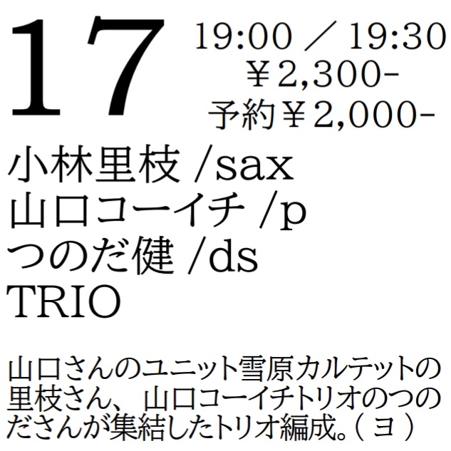 2025年3月17日(月) open 19:00 start 19:30 ¥2,300(予約¥2,000) 小林里枝(sax) 山口コーイチ(p) つのだ健(ds) TRIO 山口さんのユニット雪原カルテットの里枝さん、山口コーイチトリオのつのださんが集結したトリオ編成。(ヨ)