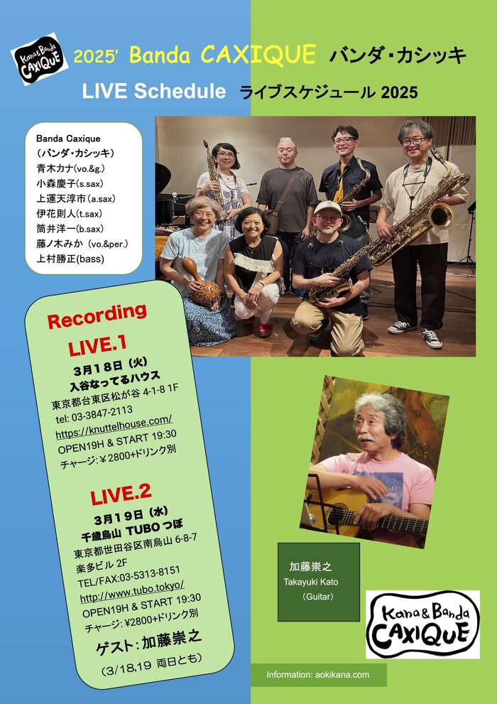 2025年3月18日(火) open 19:00 start 19:30 ¥2,800(予約¥2,500) Banda Caxique/ 青木カナ(vo,g) 小森慶子(ss) 上運天淳市(as) 伊花則人(ts) 筒井洋一(bs) 藤ノ木みか(vo,per) 上村勝正(b) ゲスト:加藤崇之(g) トリオSAMBA LENTOとしてご出演のカナさんがフロントである大所帯ユニット。ジャパニーズブラジルミュージック!(ヨ)