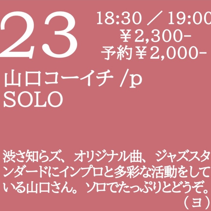 2025年3月23日(日) open 18:30 start 19:00 ¥2,300(予約¥2,000) 山口コーイチ(p) SOLO 渋さ知らズ、オリジナル曲、ジャズスタンダードにインプロと多彩な活動をしている山口さん。ソロでたっぷりとどうぞ。(ヨ)