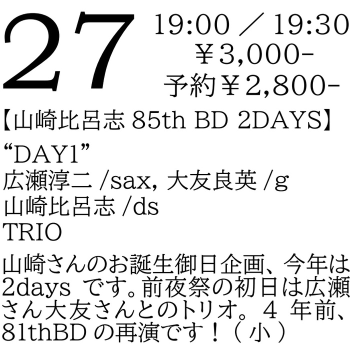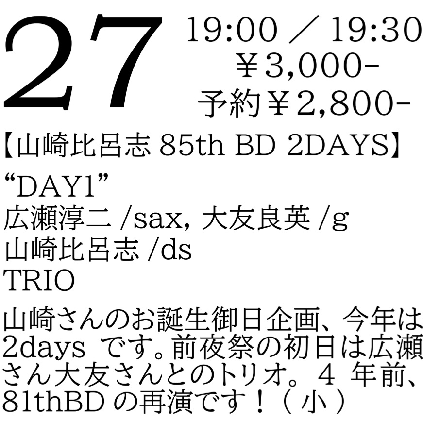 2025年3月27日(木) open 19:00 start 19:30 ¥3,000(予約¥2,800) 【山崎比呂志85th BD 2DAYS】 "DAY1" 広瀬淳二(sax) 大友良英(g) 山崎比呂志(ds) TRIO 山崎さんのお誕生御日企画、今年は2daysです。前夜祭の初日は広瀬さん大友さんとのトリオ。4年前、81thBDの再演です!(小)