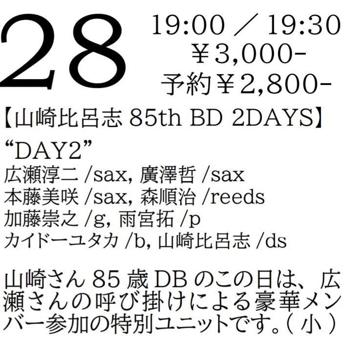 2025年3月28日(金) open 19:00 start 19:30 ¥3,000(予約¥2,800) 【山崎比呂志85th BD 2DAYS】 "DAY2" 広瀬淳二(sax) 廣澤哲(sax) 本藤美咲(sax) 森順治(reeds) 加藤崇之(g) 雨宮拓(p) カイドーユタカ(b) 山崎比呂志(ds) 山崎さん85歳BDのこの日は、広瀬さんの呼び掛けによる豪華メンバー参加の特別ユニットです。(小)