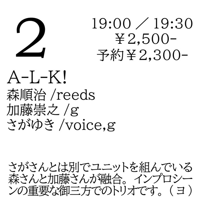 2025年4月2日(水) open 19:00 start 19:30 ¥2,500(予約¥2,300) A-L-K!/ 森順治(reeds) 加藤崇之(g) さがゆき(voice,g) さがさんとは別でユニットを組んでいる森さんと加藤さんが融合。インプロシーンの重要な御三方でのトリオです。(ヨ)