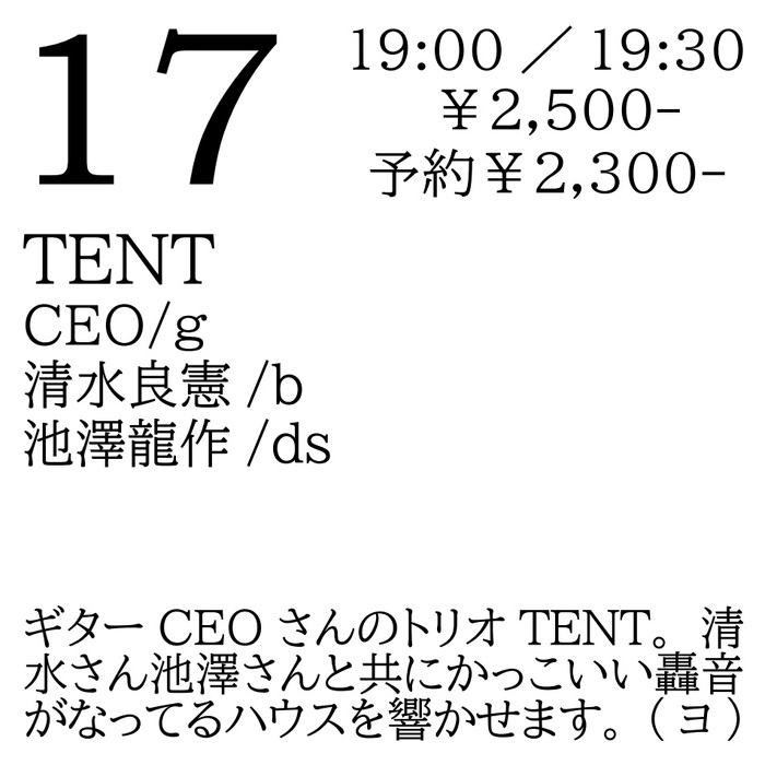 2025年4月17日(木) open 19:00 start 19:30 ¥2,500(予約¥2,300) TENT/ CEO(g) 清水良憲(b) 池澤龍作(ds) ギターCEOさんのトリオTENT。清水さん池澤さんと共にかっこいい轟音がなってるハウスを響かせます。(ヨ)