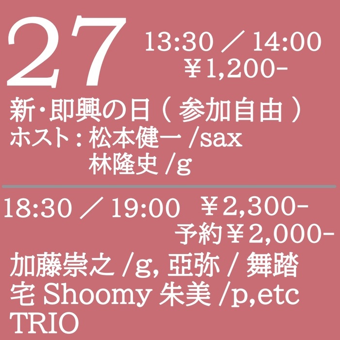2025年4月27日(日) open 18:30 start 19:00 ¥2,300(予約¥2,000) 加藤崇之(g) 亞弥(舞踏) 宅Shoomy朱美(p,etc) TRIO 好評の加藤さんと亞弥さんの組合せに、シューミーさん。インスピレーション飛び交うセットです。(小)