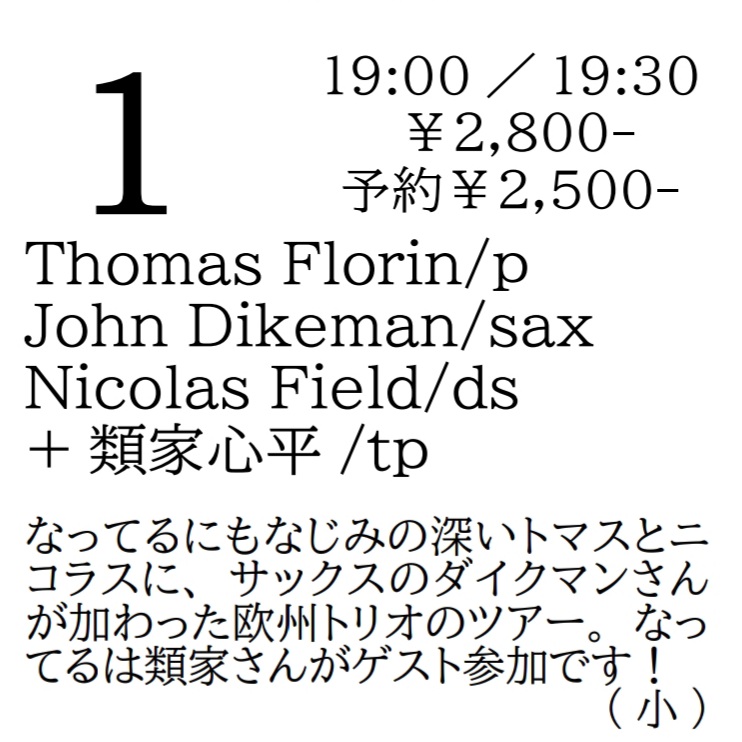 2025年5月1日(木) open 19:00 start 19:30 ¥2,800(予約¥2,500) Thomas Florin(p) John Dikeman(sax) Nicolas Field(ds) +類家心平(tp) なってるにもなじみの深いトマスとニコラスに、サックスのダイクマンさんが加わった欧州トリオのツアー。なってるは類家さんがゲスト参加です!(小)