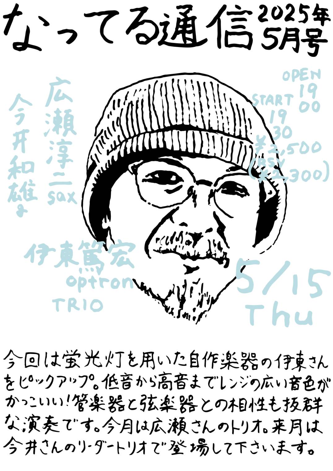 2025年5月15日(木) Pickup! open 19:00 start 19:30 ¥2,500(予約¥2,300) 広瀬淳二(sax) 今井和雄(g) 伊東篤宏(optron) TRIO 関係性の強く長い3人ならではの演奏が格別なアヴァンギャルドインプロトリオです。(ヨ)
