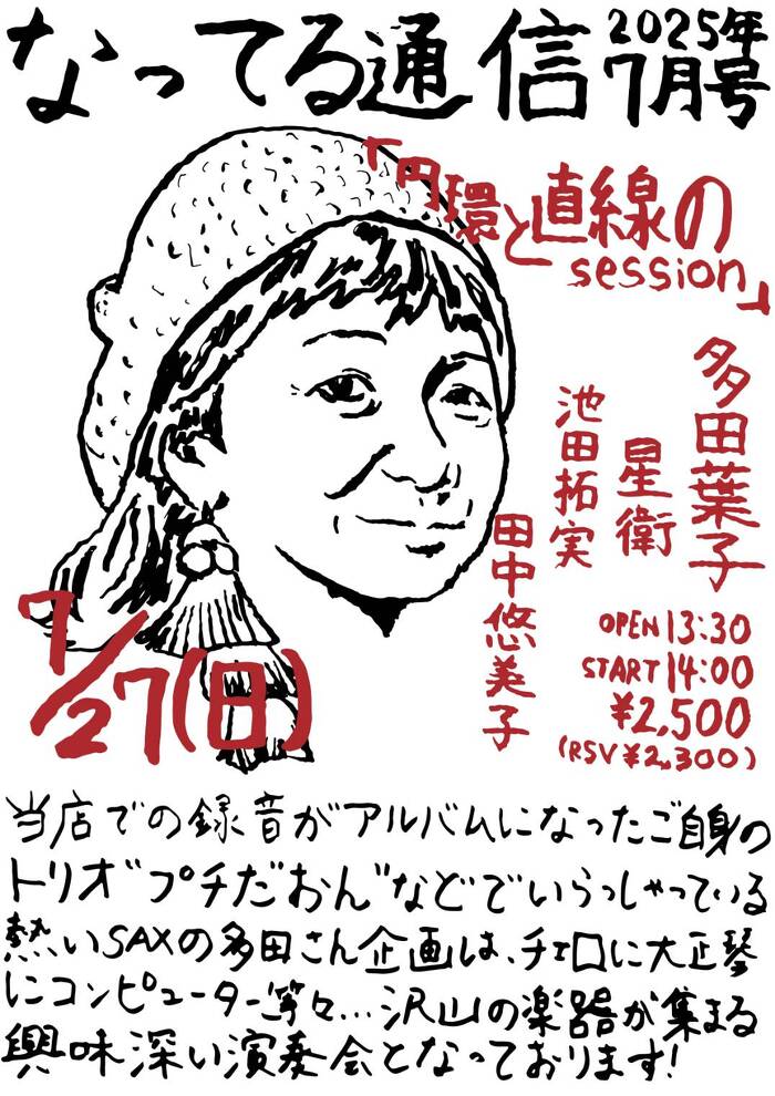 2025年7月27日(日) Pickup! open 13:30 start 14:00 ¥2,500(予約¥2,300) 「円環と直線のsession」 多田葉子(sax,cl) 星衛(vc,和笛) 池田拓実(clavicomputer) 田中悠美子(義太夫三味線,E大正琴) 様々な方向で異彩を放つ、ユニークな4人。なってるハウスならではの生々しい音空間で、未知なるセッションを散りばめる。(多)