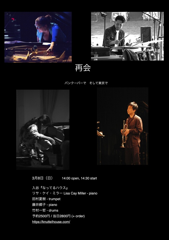 2026年3月8日(日) open 14:00 start 14:30 ¥2,800(予約¥2,500) 藤井郷子(p) Lisa Cay Miller(p) 竹村一哲(ds) 田村夏樹(tp) カナダのLisaさんと藤井さんの連弾を含むピアノ演奏に、藤井さんのTokyo Trioにも参加している一哲さんドラムス、田村さんも加わってのスペシャルセッションです。(小) ご予約フォーム 必須お名前 お名前を入力してください。 必須メールアドレス メールアドレスを入力してください。 正しいメールアドレスを入力してください。 必須お電話番号 お電話番号を入力してください。 必須ご予約人数 1名様 2名様 3名様 4名様