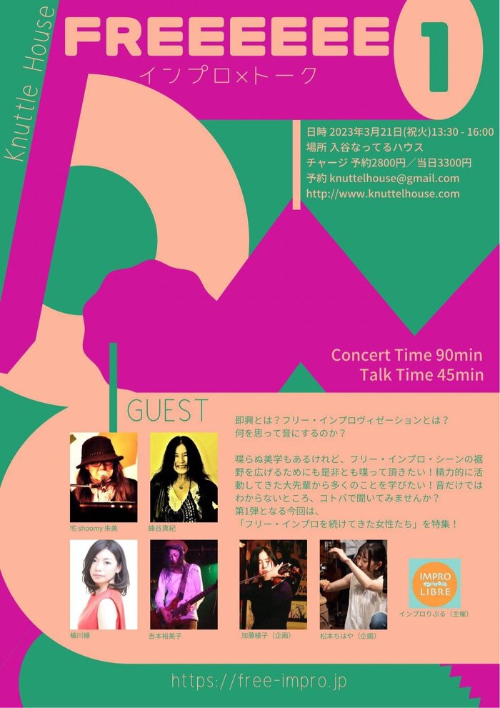 「FREEEEEE インプロ×トーク」/ 宅Shoomy朱美(vo,p) 蜂谷真紀(vo,p) 吉本裕美子(g)植川縁(sax) 加藤綾子(vl)松本ちはや(per)