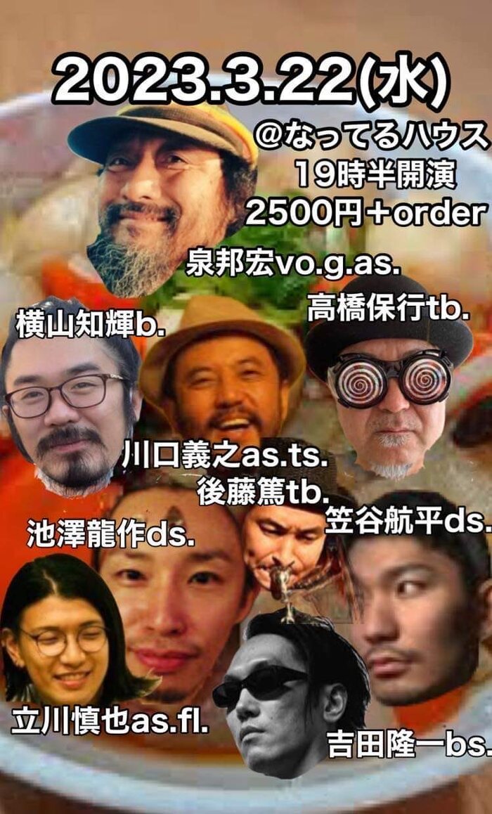 泉邦宏(sax,vo,g) 高橋保行(tb) 立川慎也(sax,fl) 川口義之(sax) 吉田隆一(sax) 後藤篤(tb) 横山知輝(b) 池澤龍作(ds) 笠谷航平(ds)