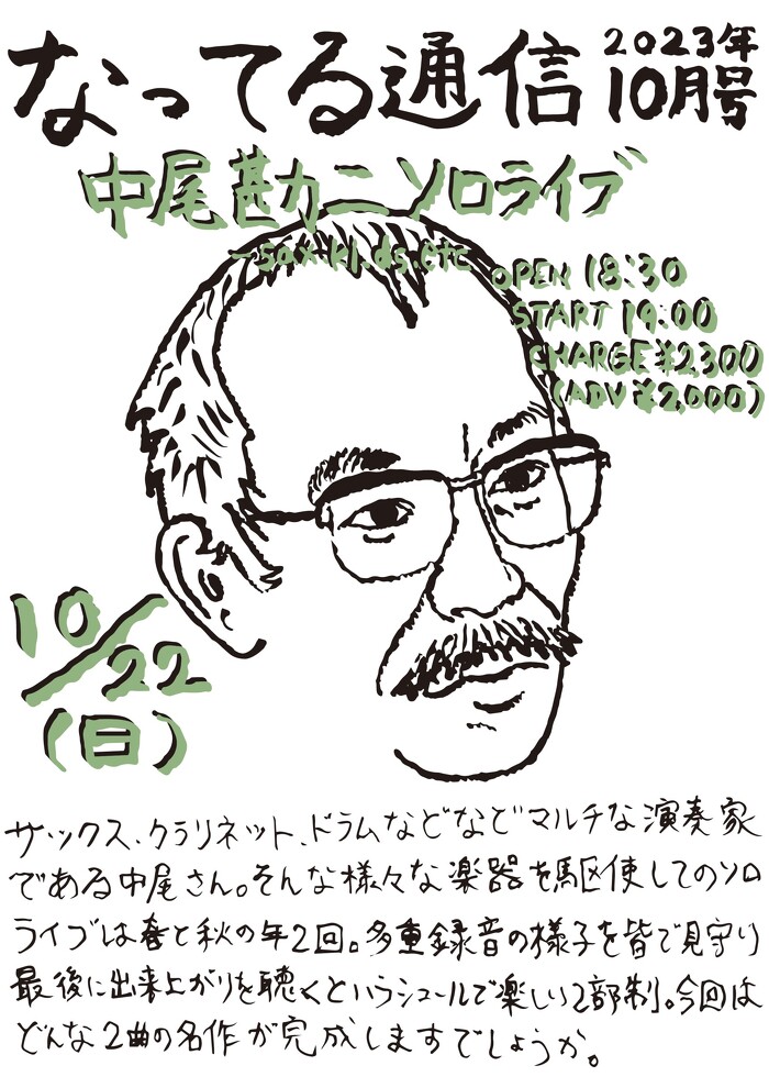 2023年10月22日(日) pickup! open 18:30 start 19:00 ¥2,300(予約¥2,000) 中尾勘二(sax,kl,ds,etc) SOLO 半年に1度の中尾さんソロ。多重録音の様子を見守り出来上がりを聴くお楽しみ会。過去回の録音も遂に音源化!(ヨ)