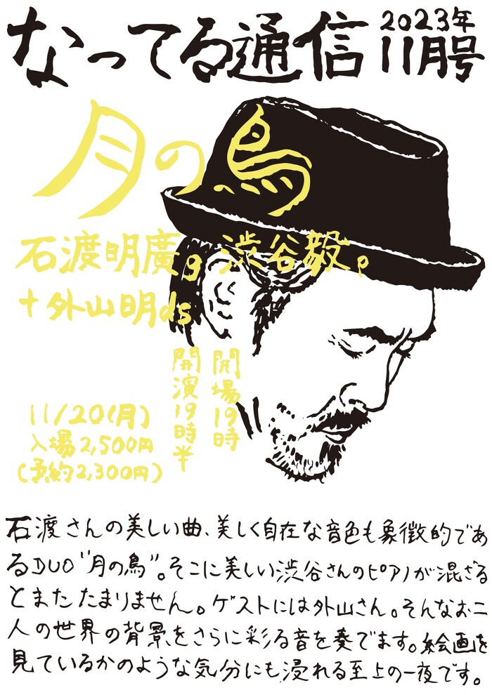 2023年11月20日(月) open 19:00 start 19:30 ¥2,500(予約¥2,300) 月の鳥/ 渋谷毅(p) 石渡明廣(g) ゲスト:外山明(ds) 石渡さんの不思議でかっこいい曲を中心に、ノリノリかつクールな演奏。音楽の楽しさが詰まったDUO+です。(小)
