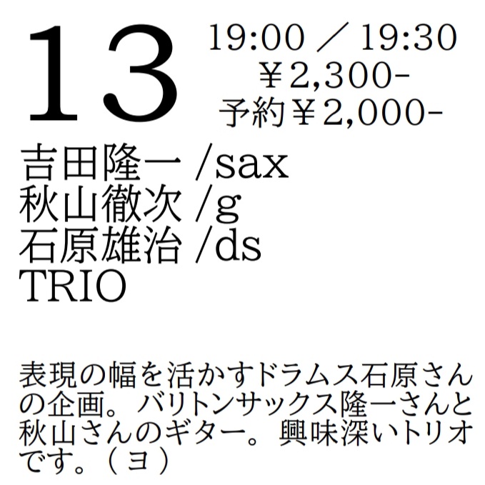 2023年12月13日(水) open 19:00 start 19:30 ¥2,300(予約¥2,000) 吉田隆一(sax) 秋山徹次(g) 石原雄治(ds) TRIO 表現の幅を活かすドラムス石原さんの企画。バリトンサックス隆一さんと秋山さんのギター。興味深いトリオです。(ヨ)
