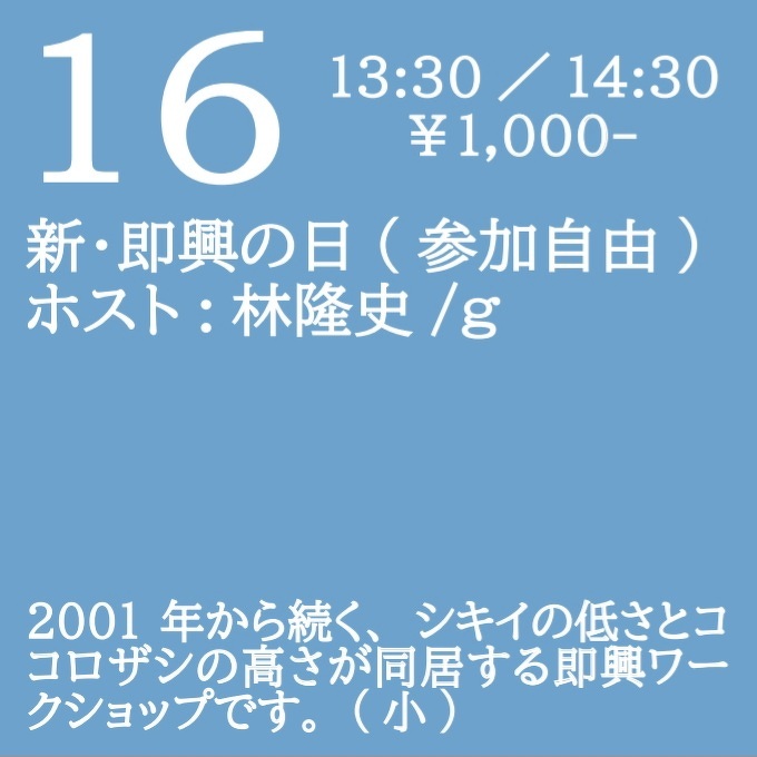 2023年12月16日(土) open 13:30 start 14:00 ¥1,000 新・即興の日(参加自由) ホスト:林隆史(g) 2001年から続く、シキイの低さとココロザシの高さが同居する即興ワークショップです。(小)