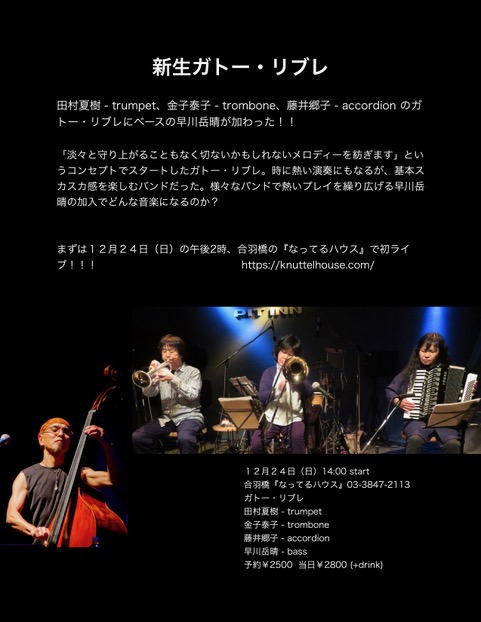 2023年12月24日(日) open 13:30 start 14:00 ¥2,800(予約¥2,500) ガトー・リブレ/ 田村夏樹(tp) 藤井郷子(acc) 金子泰子(tb) 早川岳晴(b) 新生ガトー・リブレ。最初のカルテットからトリオを経て、また別の形のカルテットに。アコースティックで無国籍な音楽の世界。(小)