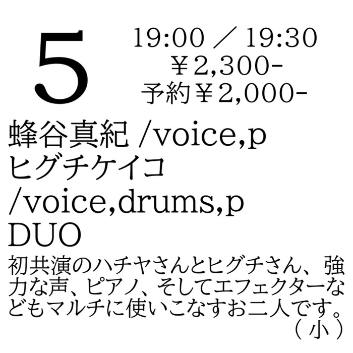 2024年1月5日(金) open 19:00 start 19:30 ¥2,300(予約¥2,000) 蜂谷真紀(voice,p) ヒグチケイコ(voice,drums,p) DUO 初共演のハチヤさんとヒグチさん、強力な声、ピアノ、そしてエフェクターなどもマルチに使いこなすお二人です。(小)