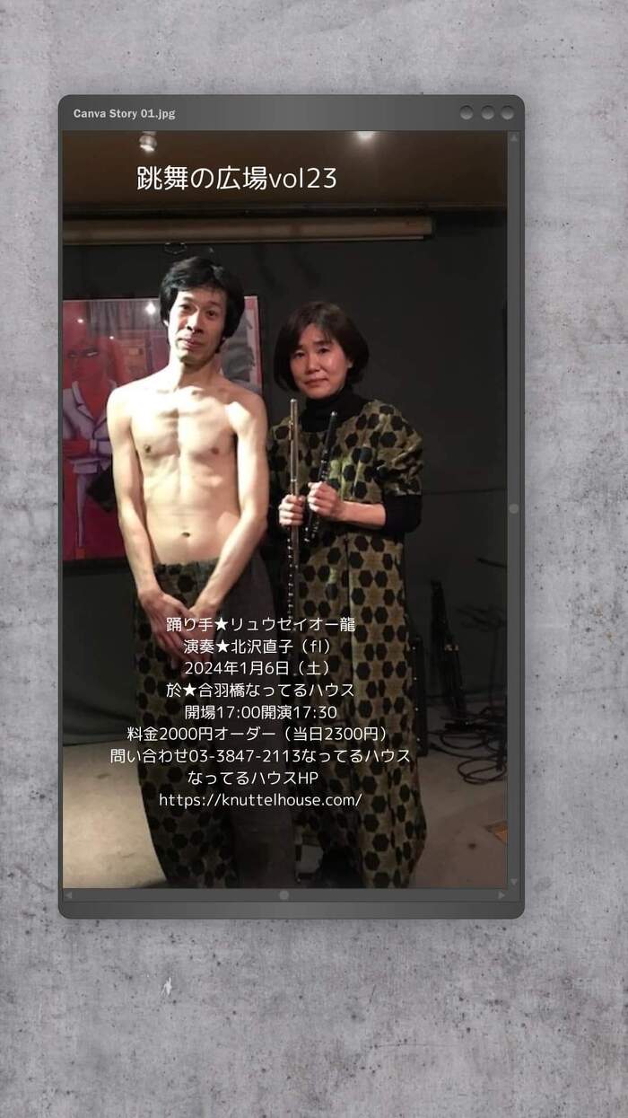 2024年1月6日(土) open 17:00 start 17:30 ¥2,300(予約¥2,000) "跳舞の広場 vol23" リュウセイオー龍(踊り) 北沢直子(fl) 野戦の月の踊り手リュウセイオーのシリーズ23弾は、情熱的でアグレッシブなフルートの北沢さんと。(小)
