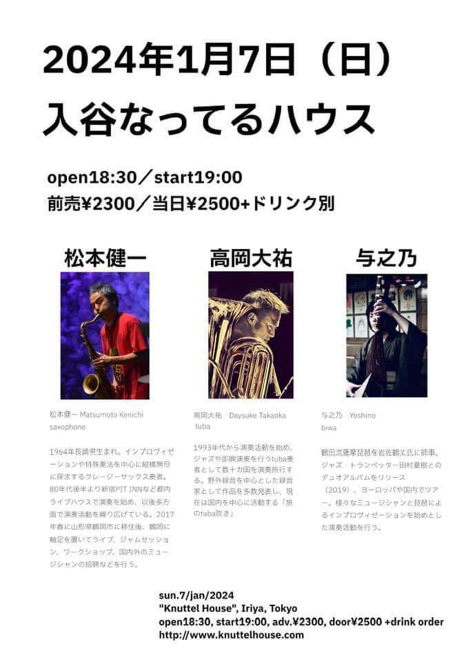 2024年1月7日(日) open 18:30 start 19:00 ¥2,500(予約¥2,300) 松本健一(sax) 高岡大祐(tuba) 与之乃(biwa) TRIO 鶴岡の人マツケン、久々の登場。与之乃さんと高岡さんとの味わい深い即興です。(小)