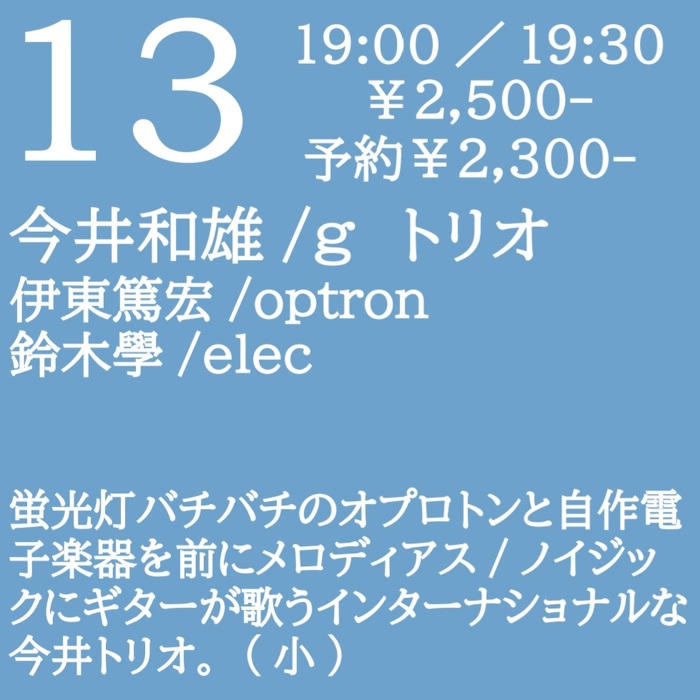 2024年1月13日(土) open 19:00 start 19:30 ¥2,500(予約¥2,300) 今井和雄(g)トリオ/ 伊東篤宏(optron) 鈴木學(elec) 蛍光灯バチバチのオプロトンと自作電子楽器を前にメロディアス/ノイジックにギターが歌うインターナショナルな今井トリオ。(小)