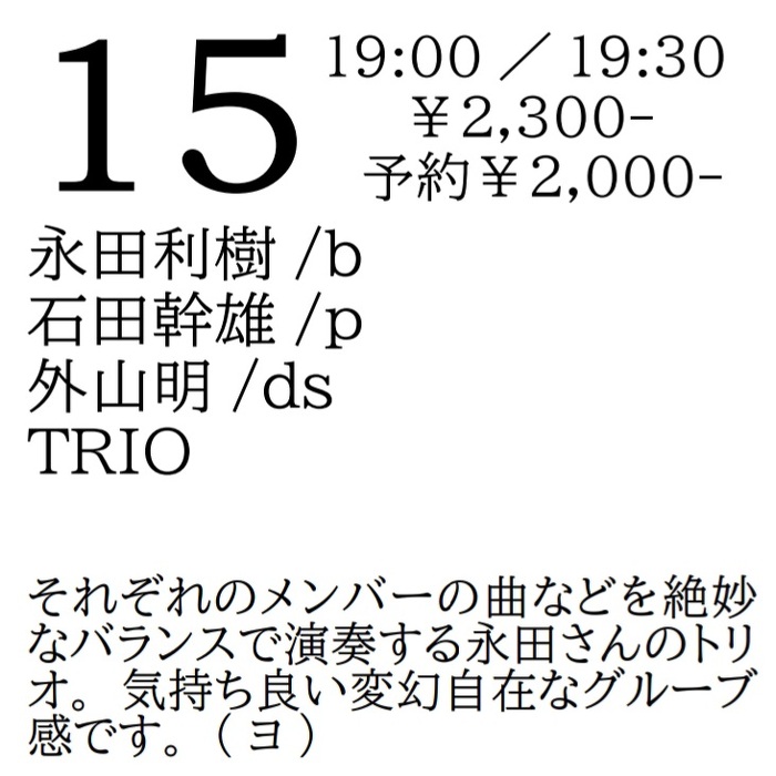 2024年1月15日(月) open 19:00 start 19:30 ¥2,300(予約¥2,000) 永田利樹(b) 石田幹雄(p) 外山明(ds) TRIO それぞれのメンバーの曲などを絶妙なバランスで演奏する永田さんのトリオ。気持ち良い変幻自在なグルーブ感です。(ヨ)