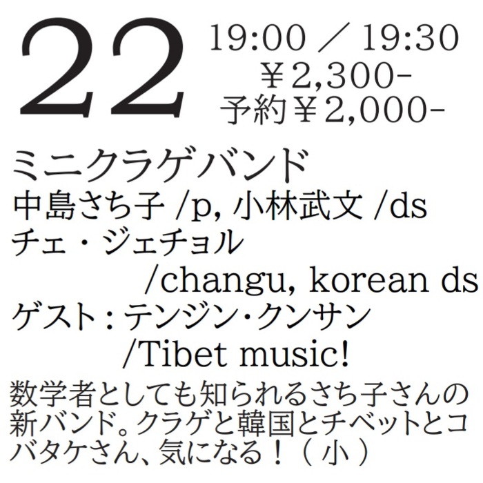 2024年1月22日(月) open 19:00 start 19:30 ¥2,300(予約¥2,000) ミニクラゲバンド/ 中島さち子(p) 小林武文(ds) チェ・ジェチョル(changu, korean ds) ゲスト:テンジン・クンサン(Tibet music!) 数学者としても知られるさち子さんの新バンド。クラゲと韓国とチベットとコバタケさん、気になる!(小)