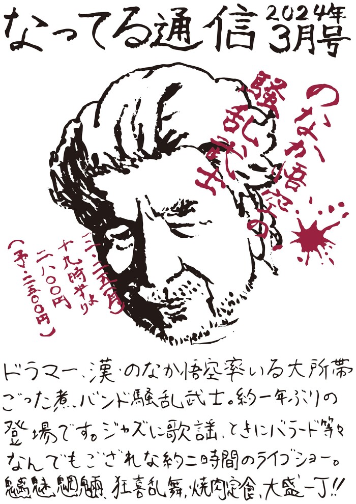 2024年3月25日(月) open 19:00 start 19:30 ¥2,800(予約¥2,500) 騒乱武士/ のなか悟空(ds) 川畑よしのすけ(b) 西田紀子(fl) 立花秀輝(sax) 加藤一平(g) 香村かをり(per) 天神直樹(tp) 小林ヤスタカ(sax) 蜂谷真紀(vo) 清水麻八子(vo) 猪月桃衣(舞) 騒乱武士、10ヶ月ぶりなってるハウス。盛りで勝負!? いつものメンバーがいたりいなかったりの特別11人編成。(小)